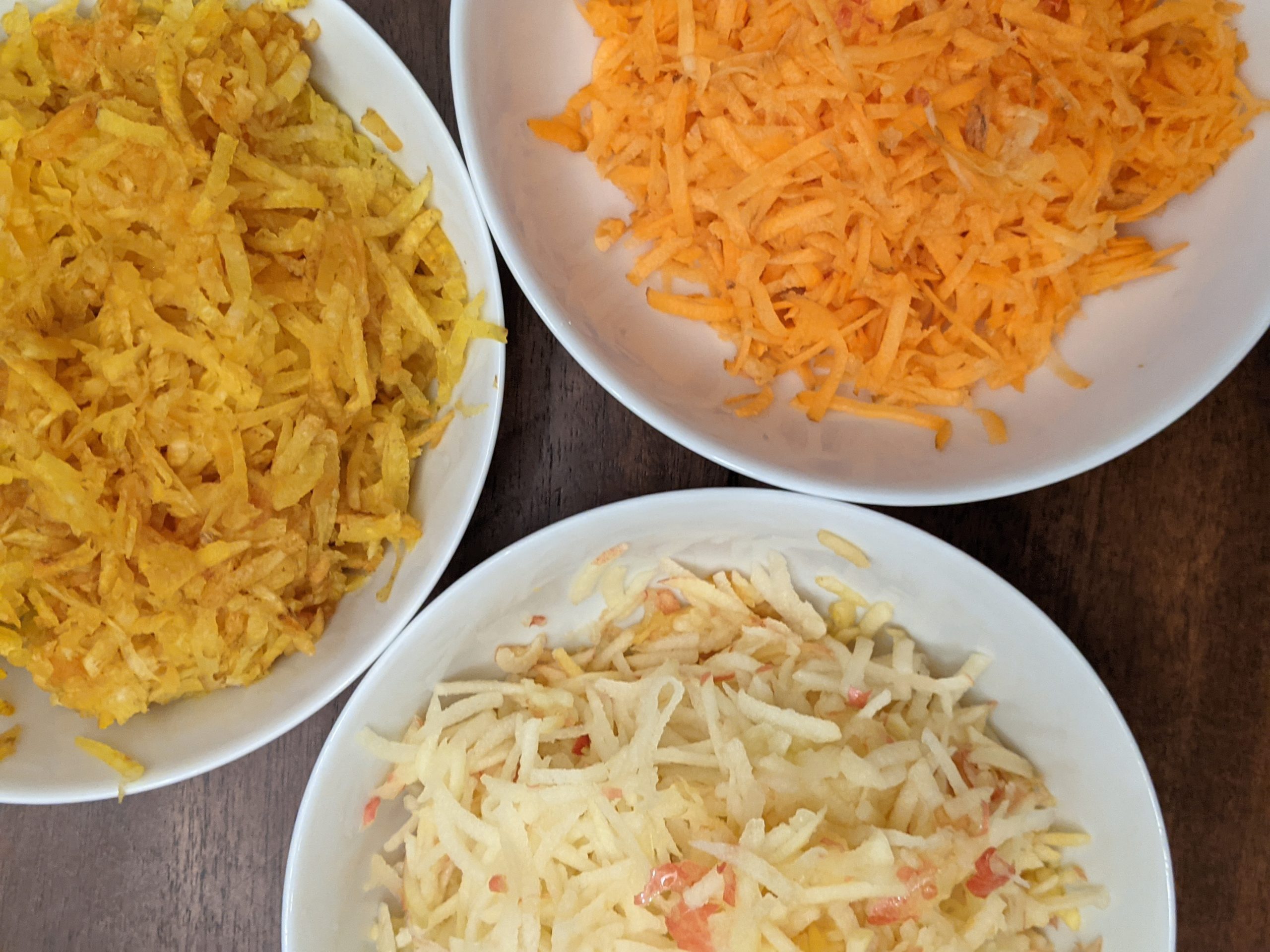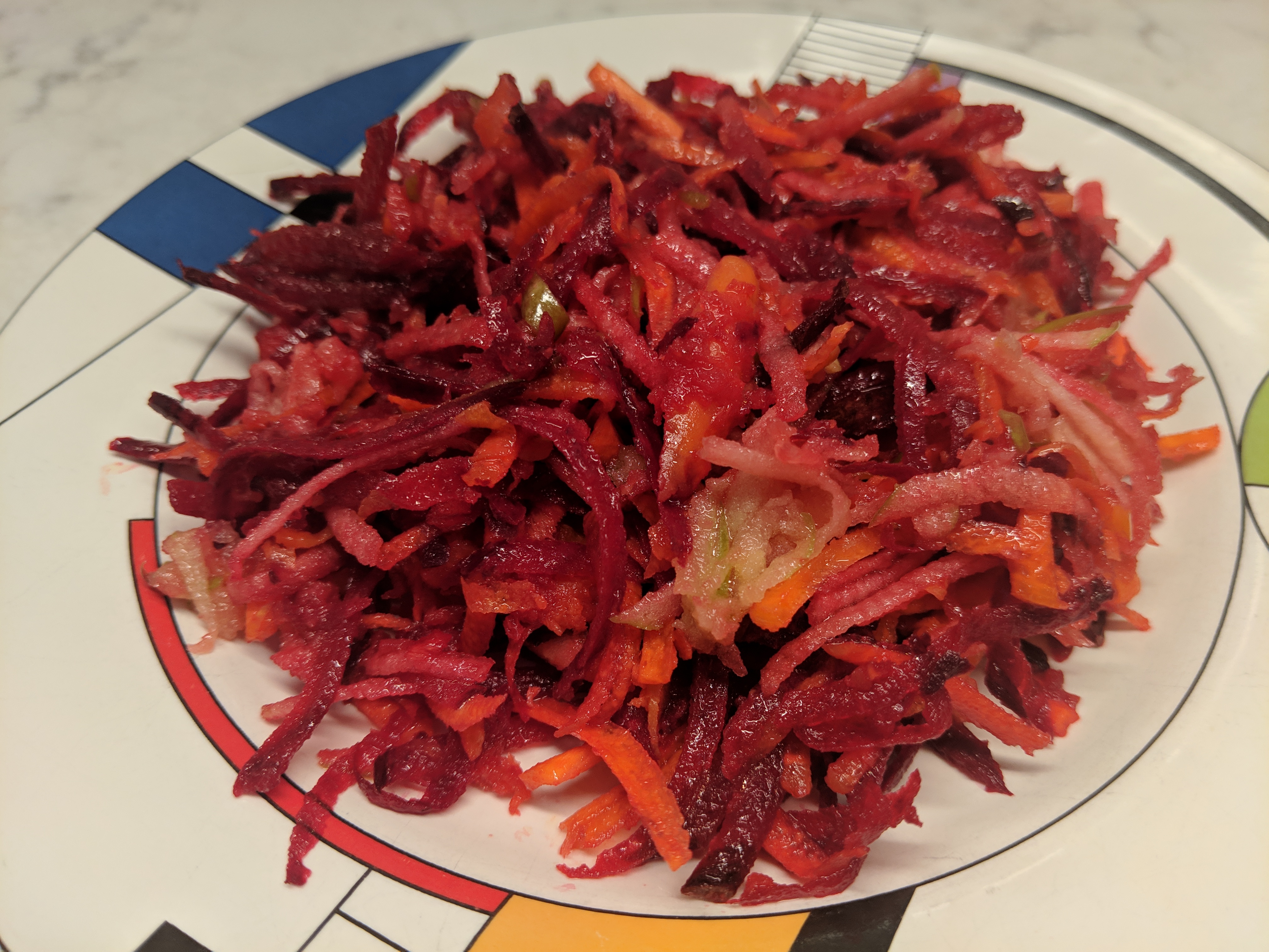 - Use a box grater or food processor with a shredding blade to shred apples, carrots, and beets and transfer to a large bowl.