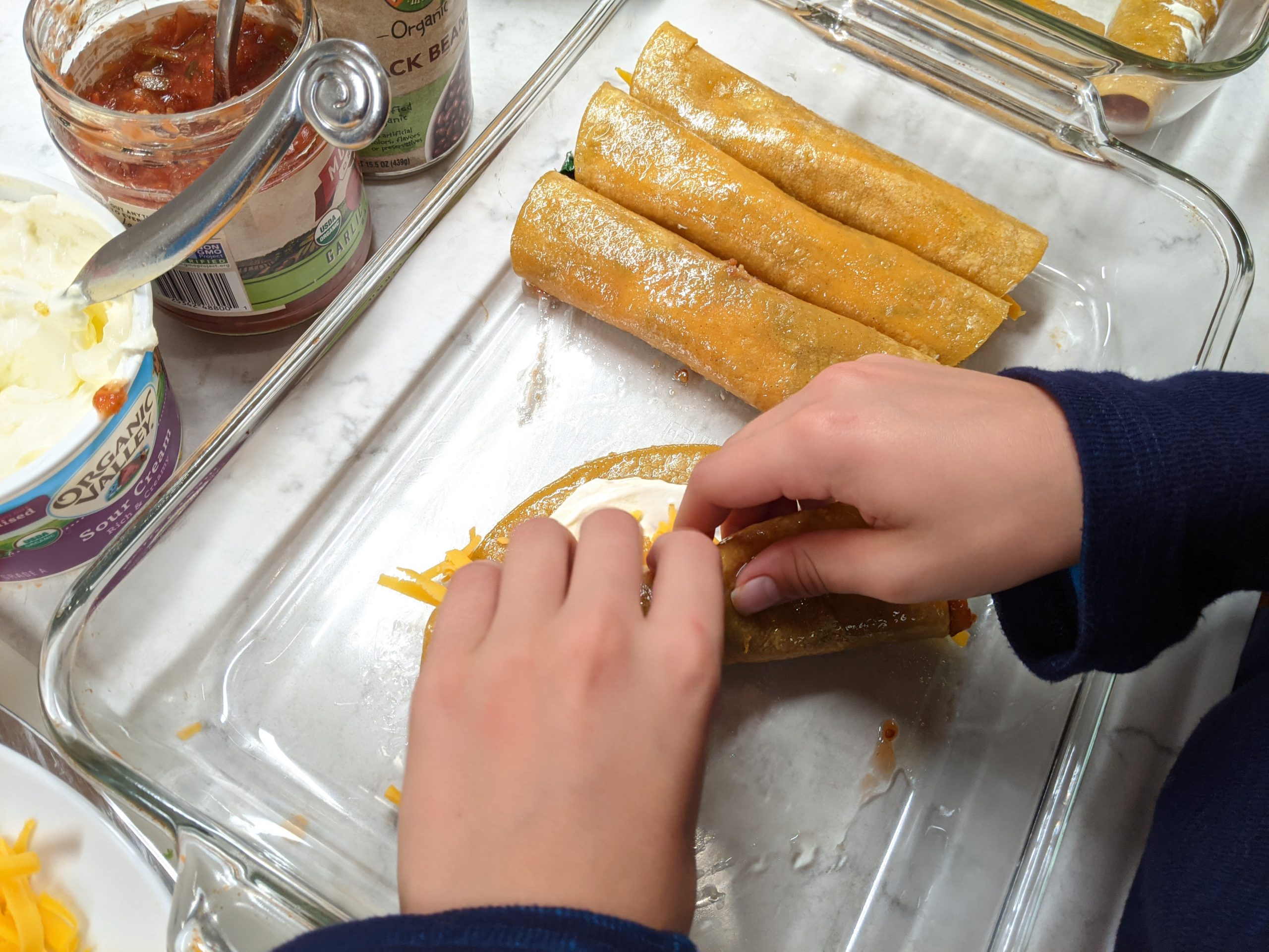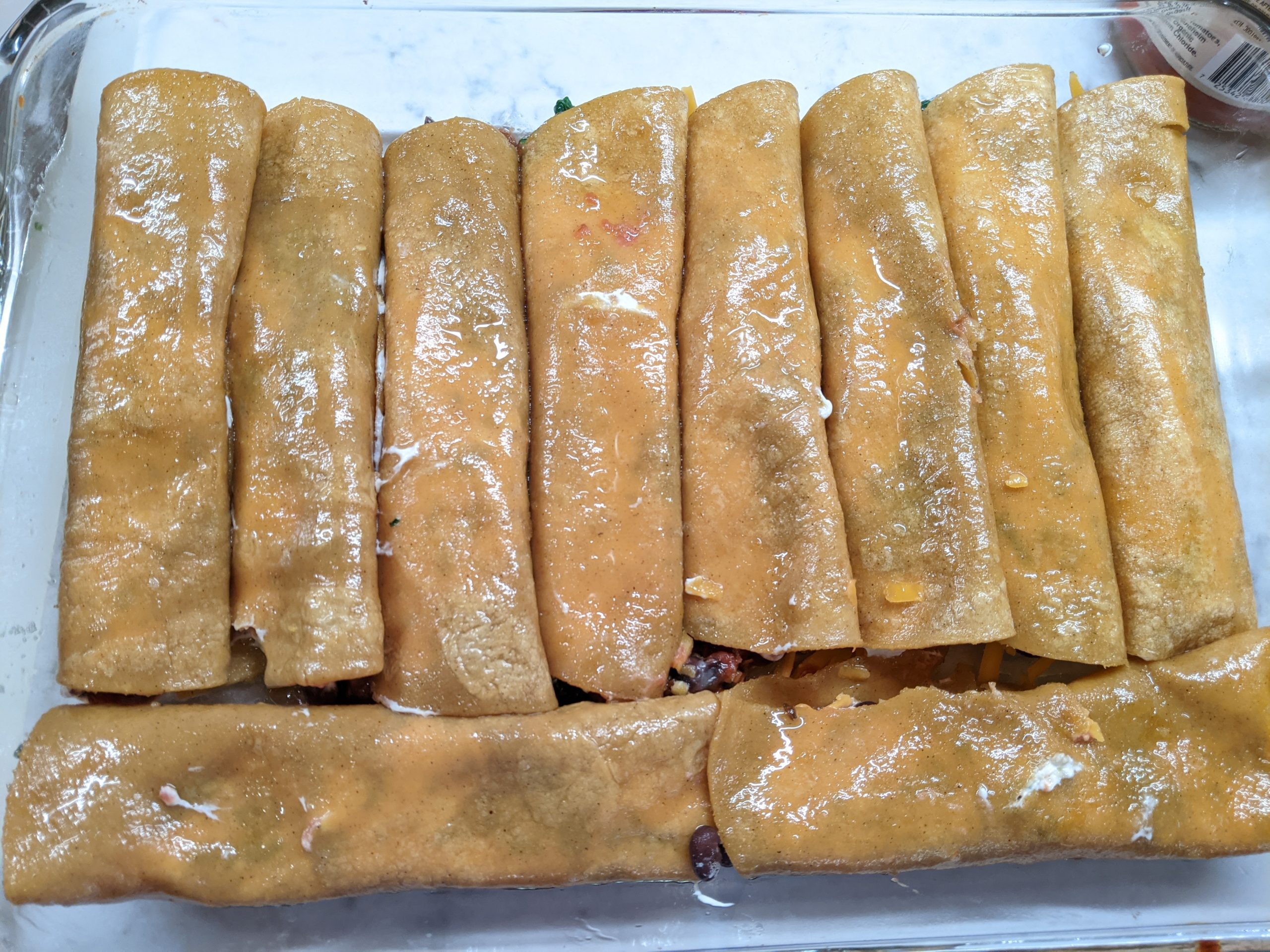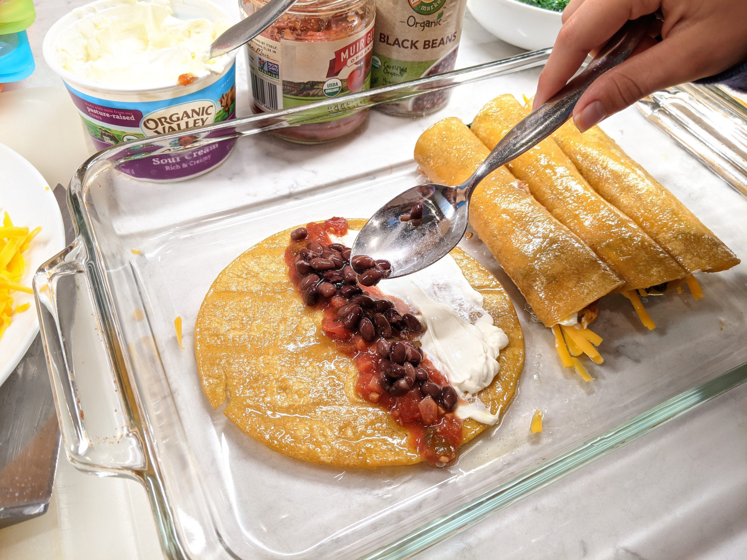 - Spread sour cream on a tortilla, then fill with a spoonful and black bean, salsa, and some shredded cheese. Roll up the tortilla and place, seam down, in a 9 x 12 inch glass baking dish. Repeat with all 12 tortillas.