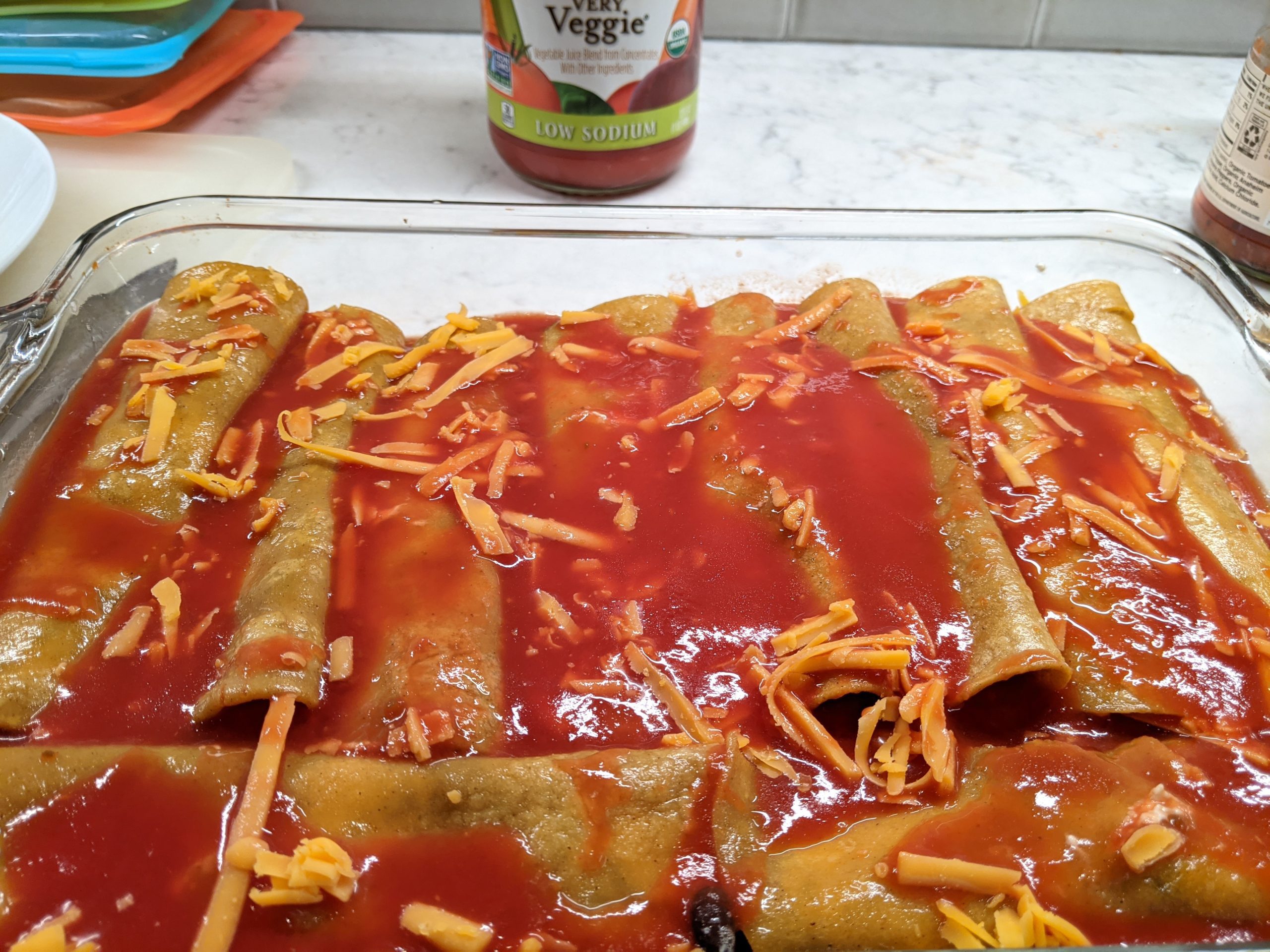 - Pour the tomato/vegetable juice over the enchiladas until they are mostly covered.