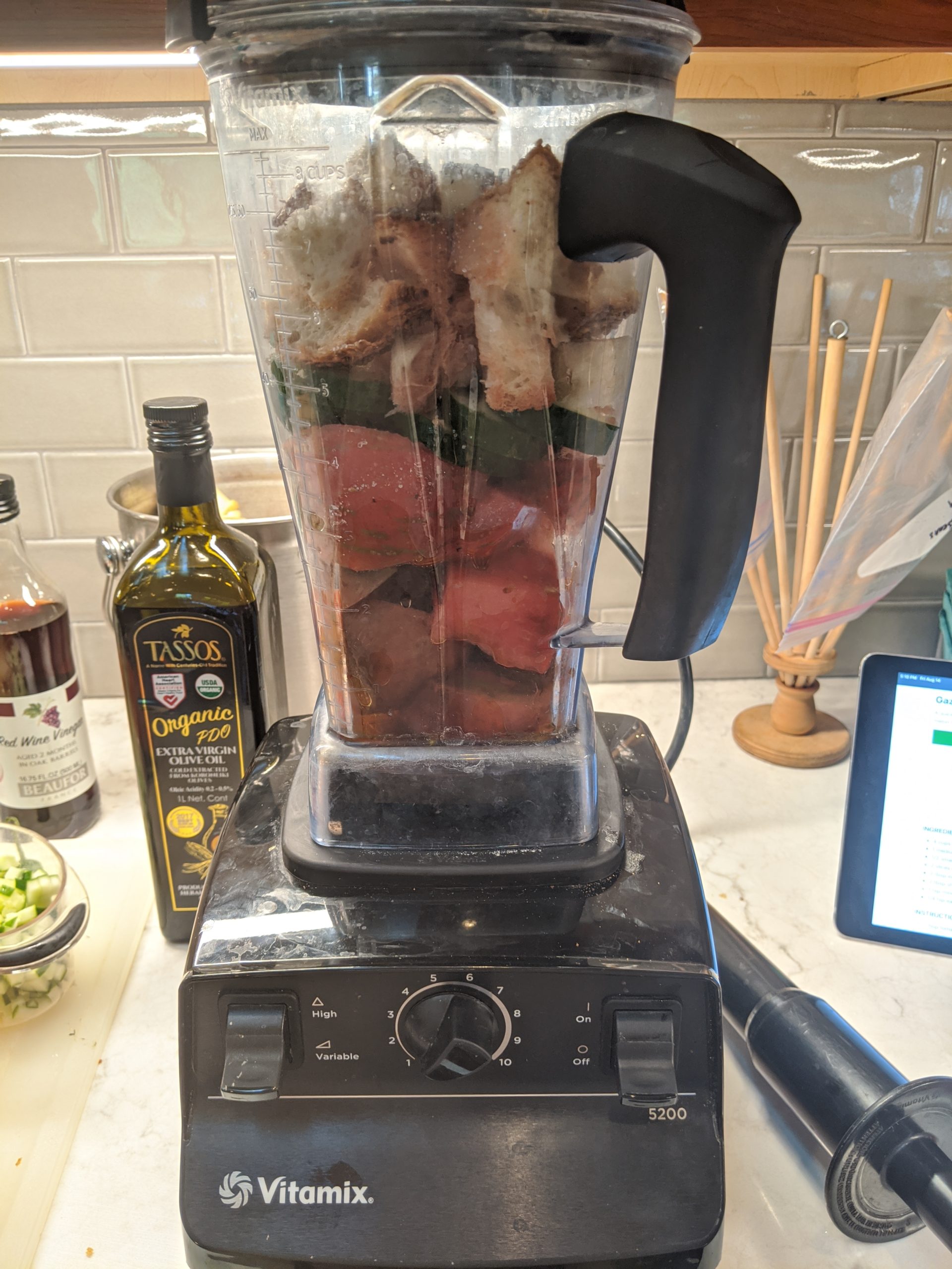 - Combine 2 cups of the tomato, half of the cucumber, and all of the onion, bread, oil, vinegar, garlic, salt, pepper, and 1/2 cup water in a blender or food processor and then blend until smooth.