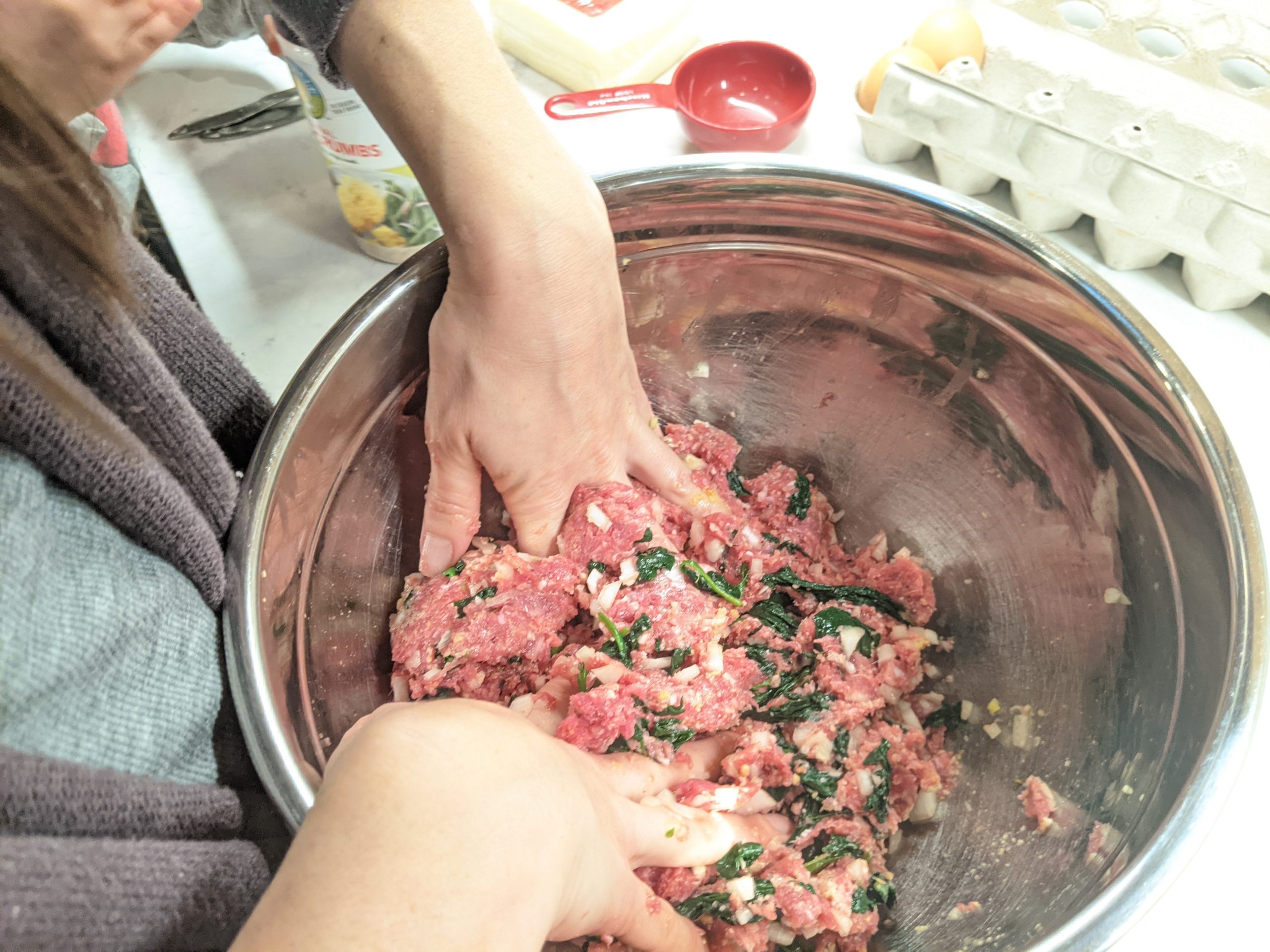 - In a large bowl, combine turkey, spinach, onion, parsley, oregano, eggs, salt, and pepper. Mix well with a spoon or your clean hands.
