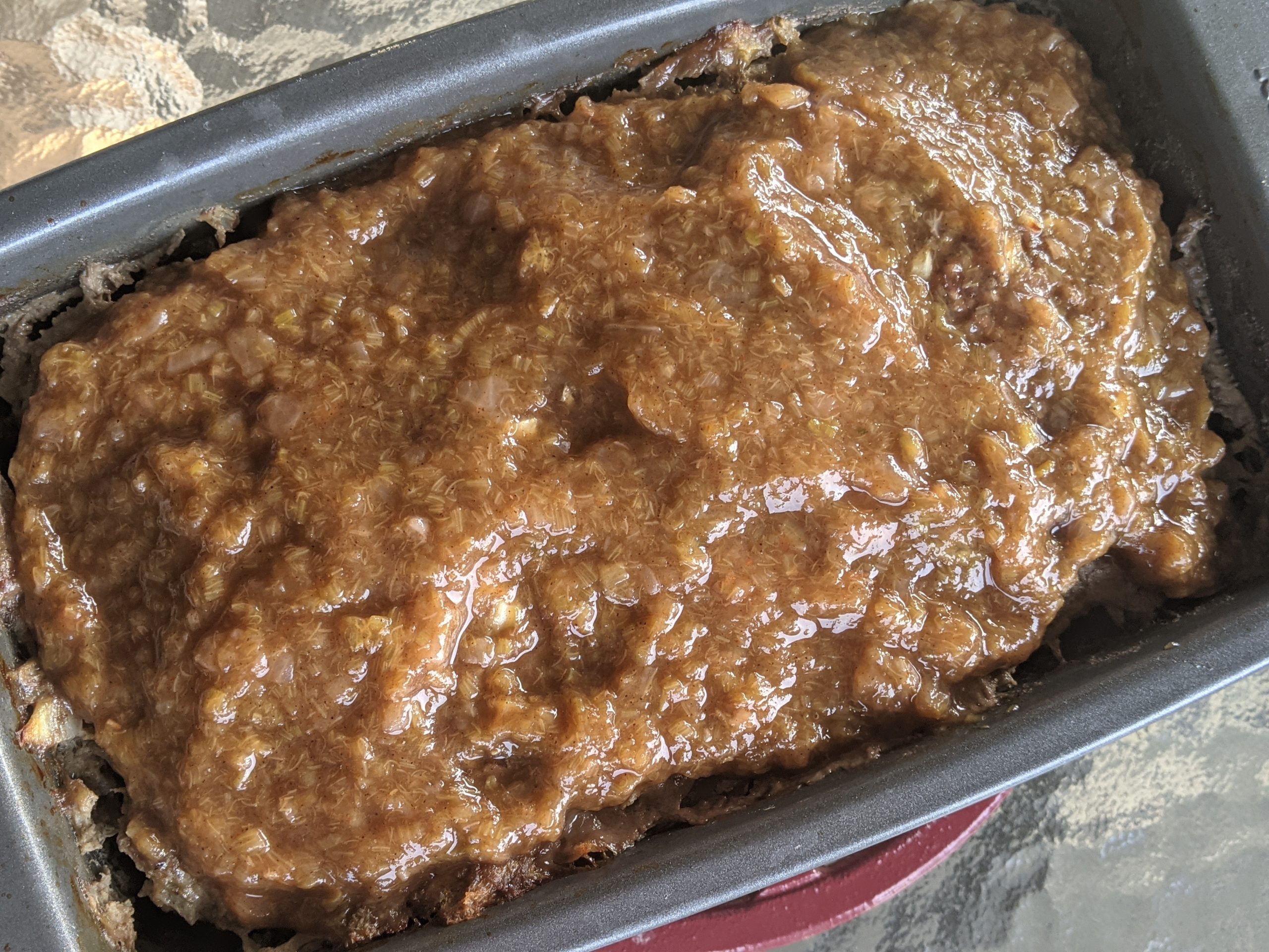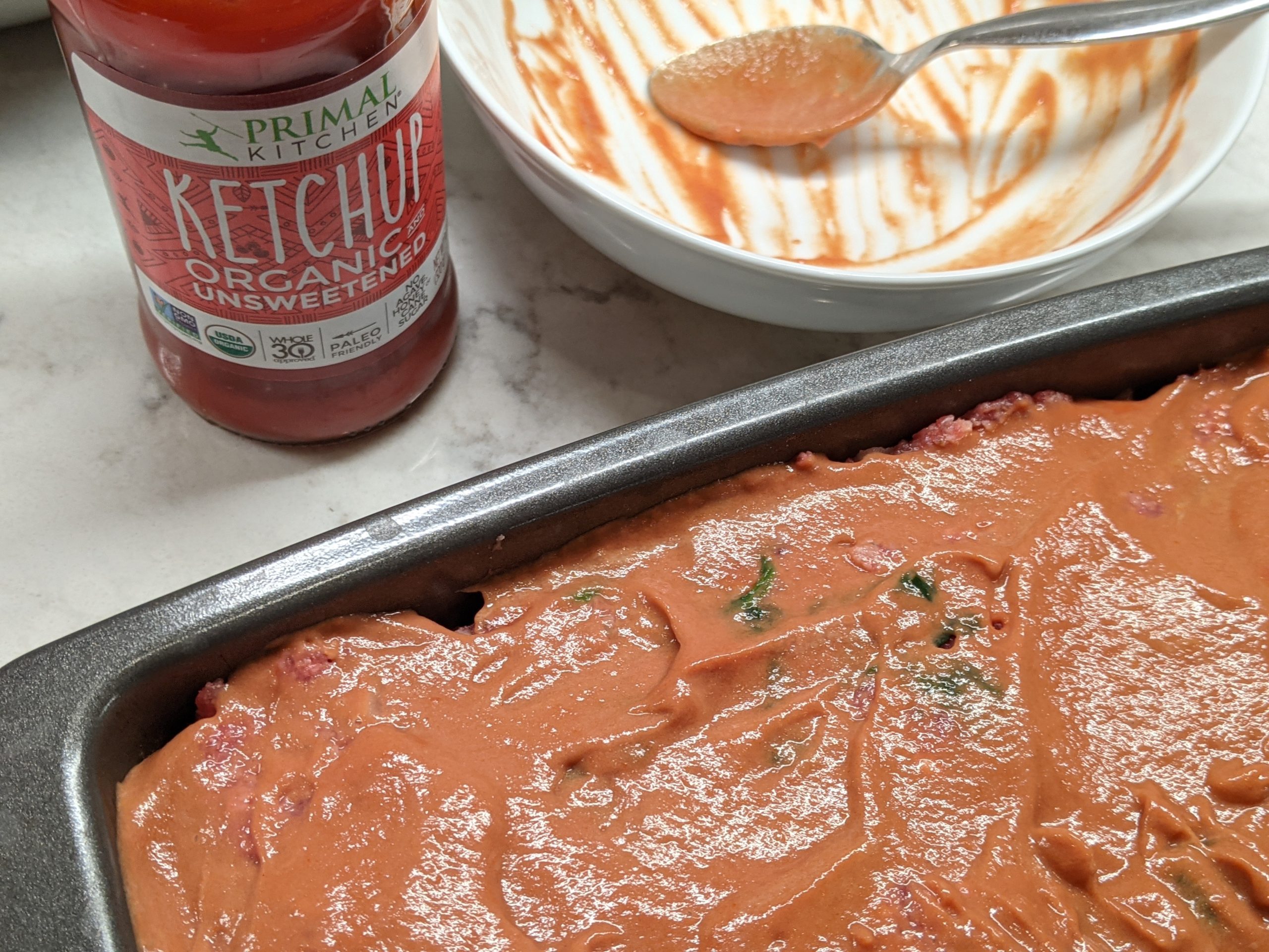 - Whisk together ketchup and mustard and spread mixture over prepared meatloaf.