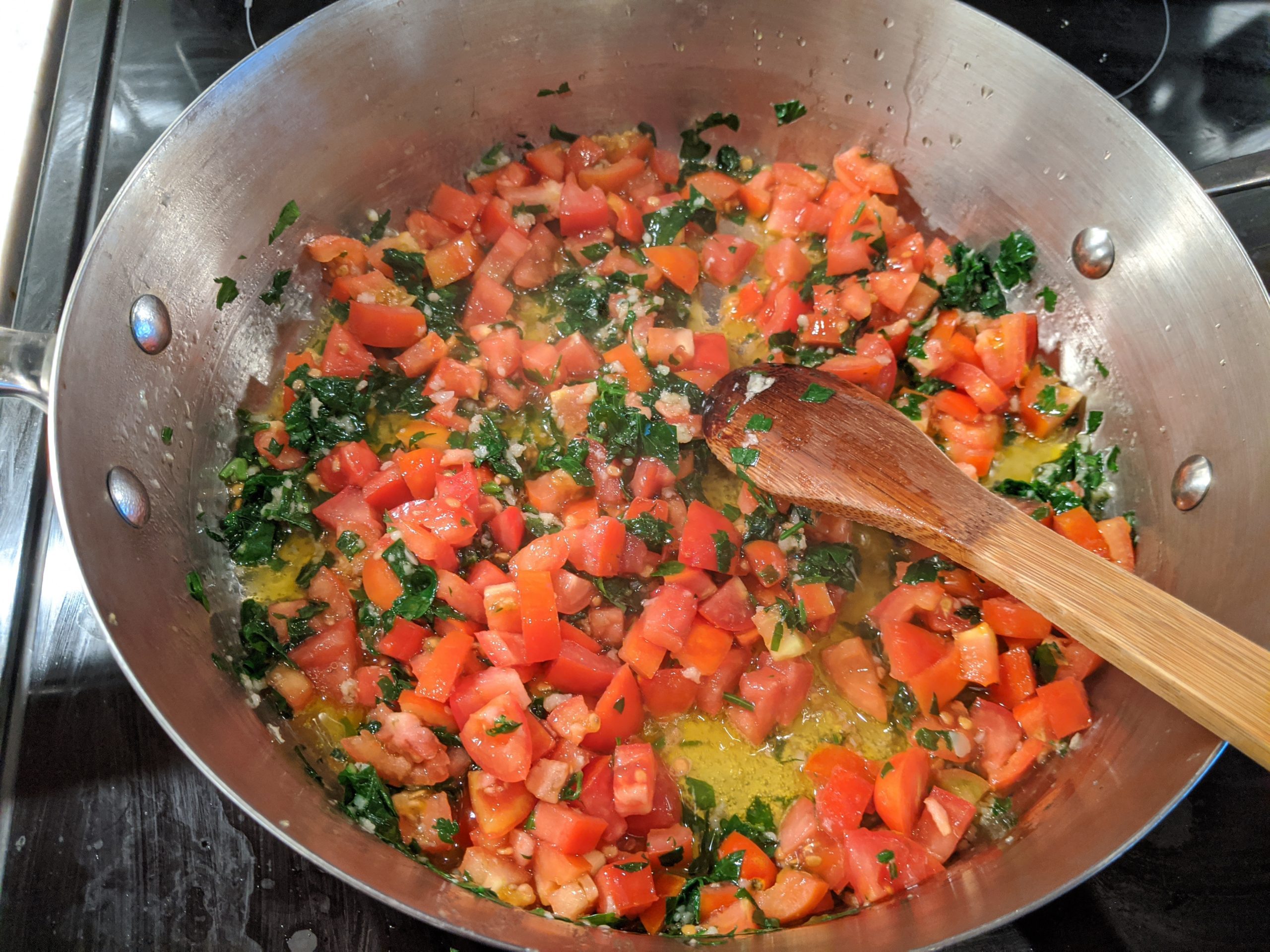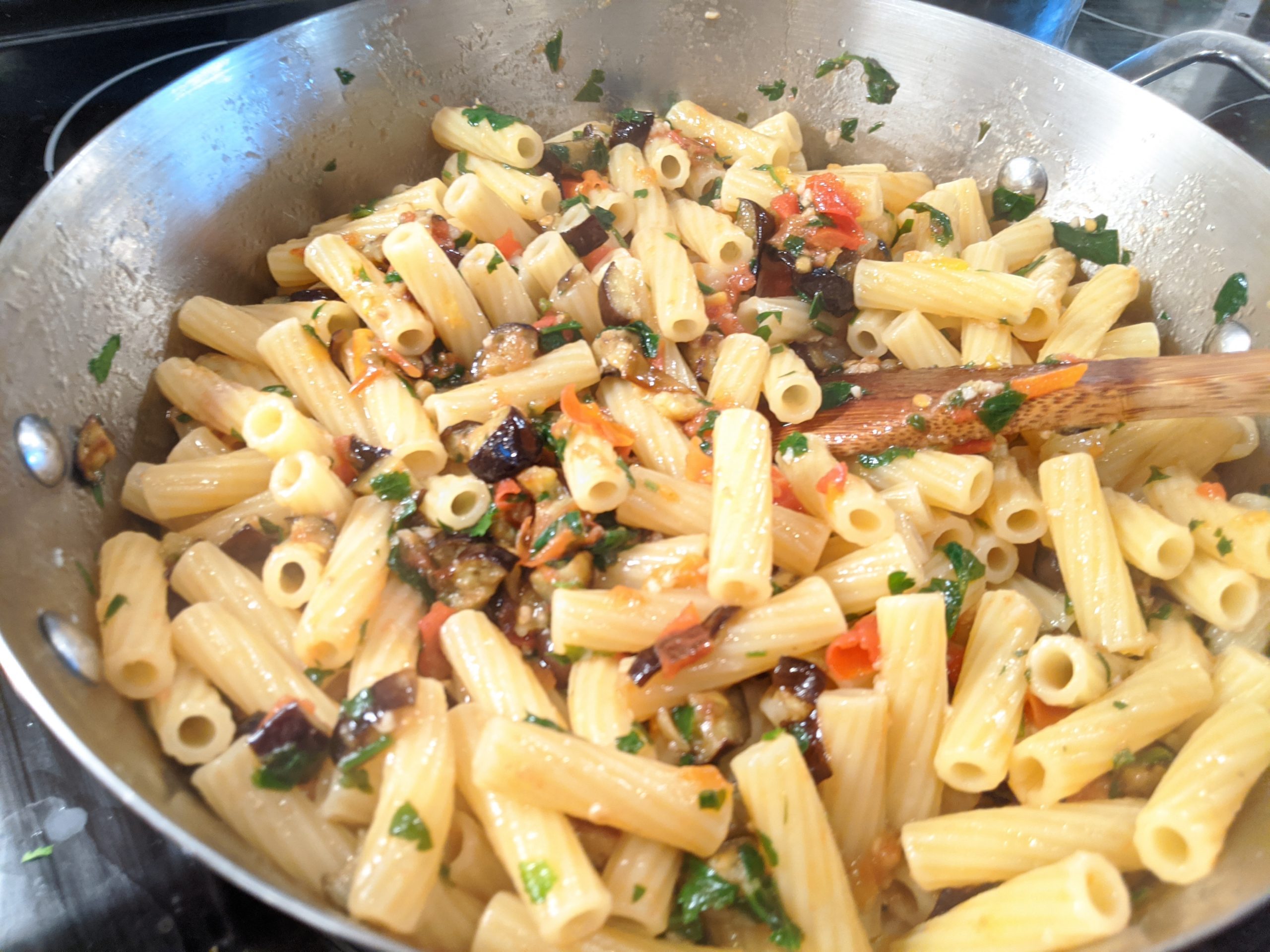 - While the eggplant is roasting, chop your tomatoes, garlic, and herbs and bring a big pot of water to a boil. Add the pasta and cook according to the package instructions.