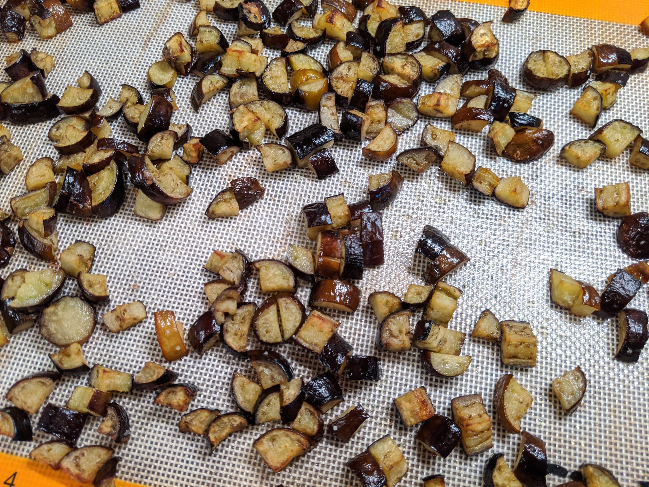 - Cut the eggplant into 1-inch dice and toss it on a rimmed baking sheet with enough olive oil to coat. Sprinkle with sea salt. Roast in the oven until browned and very tender, about 20 minutes. You will know it is done when it is nice and creamy and you can easily squish it between your fingers.
