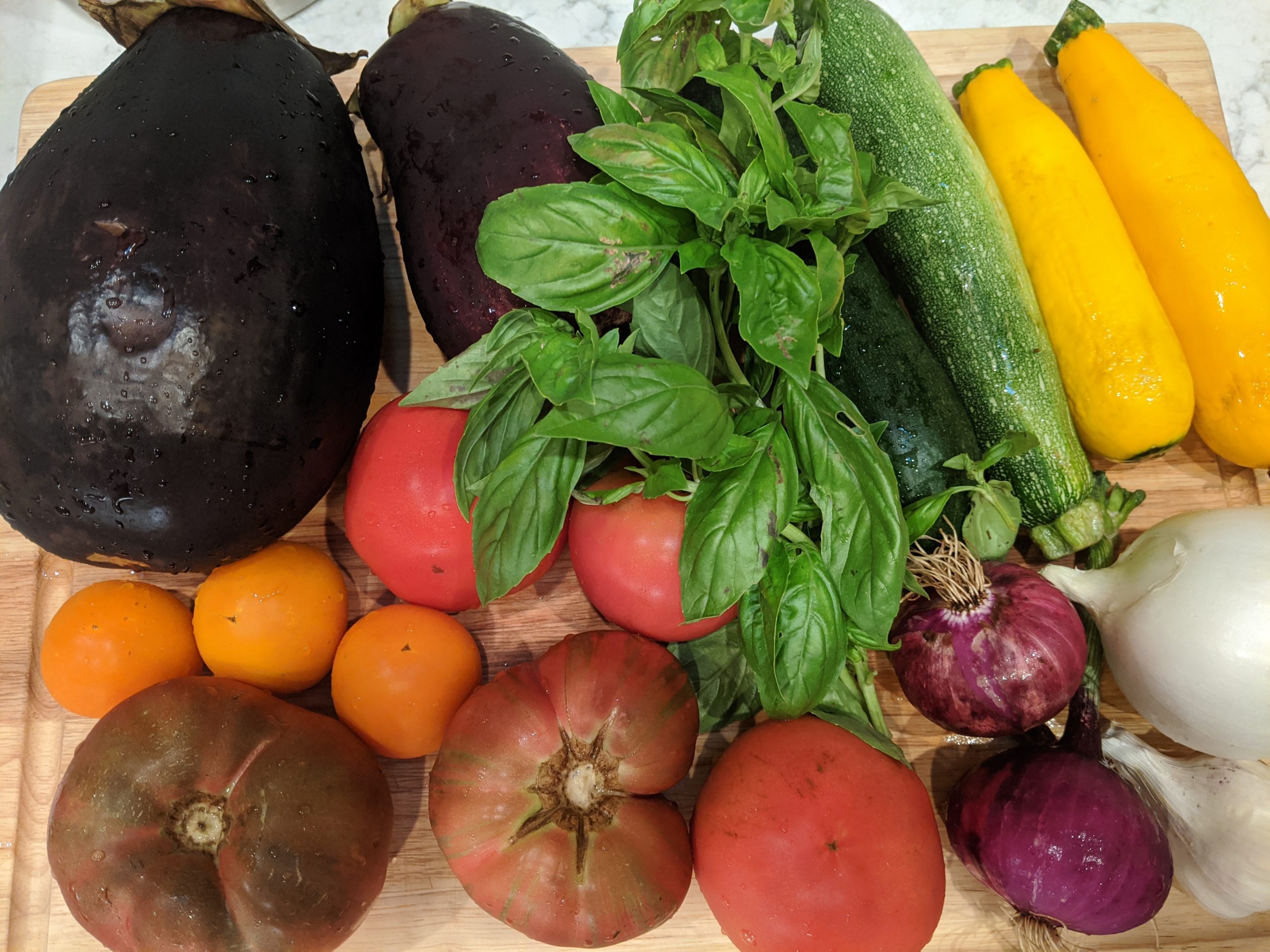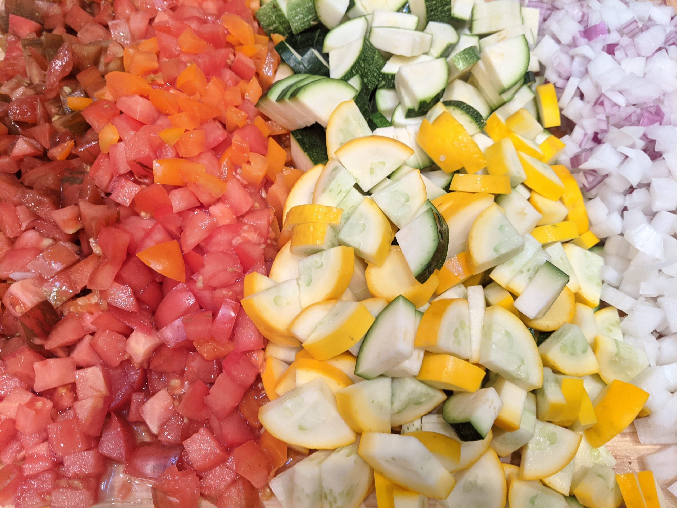 - While the sausage is cooking, chop up the onion, zucchini, tomatoes, garlic, and basil.