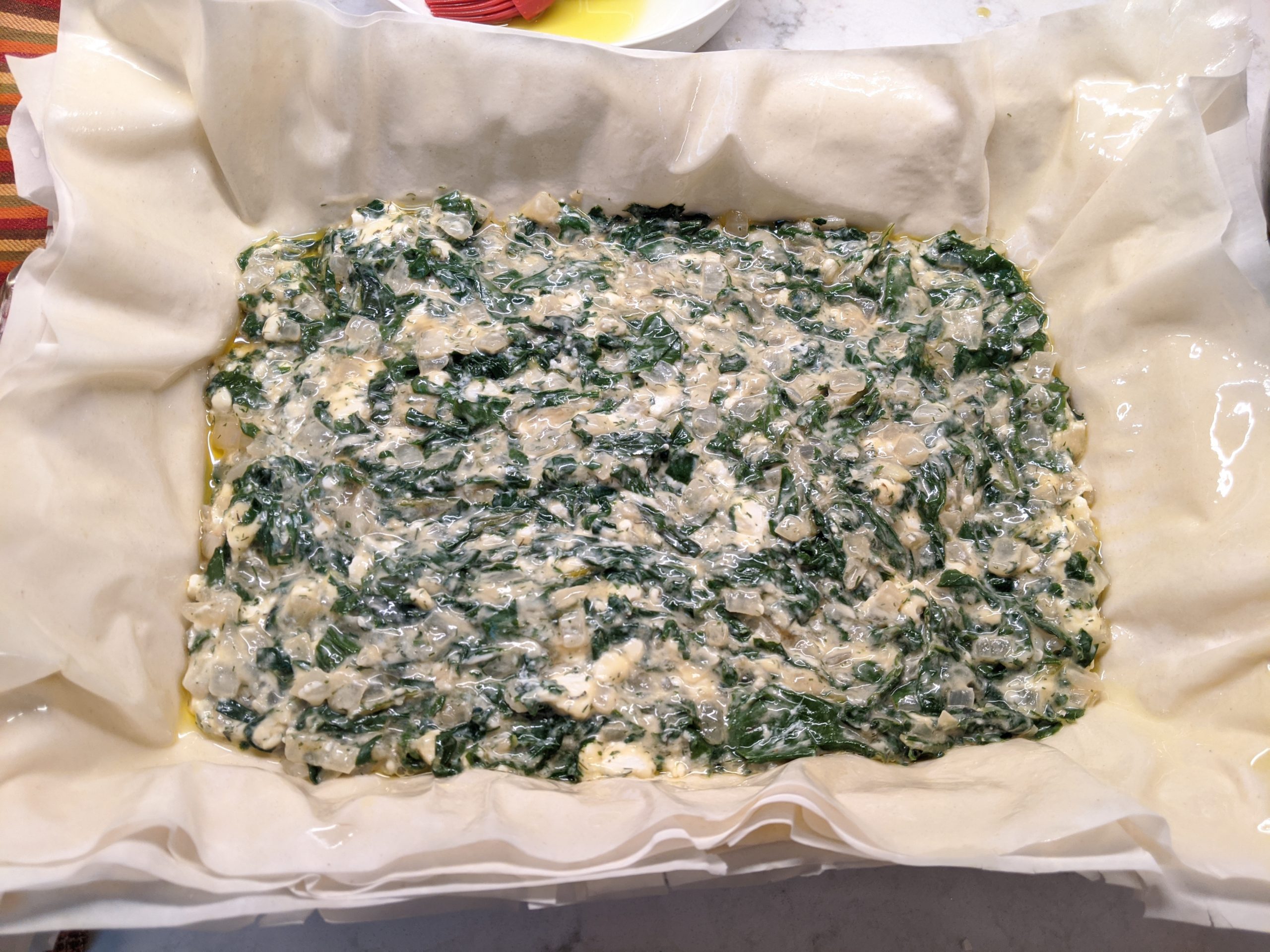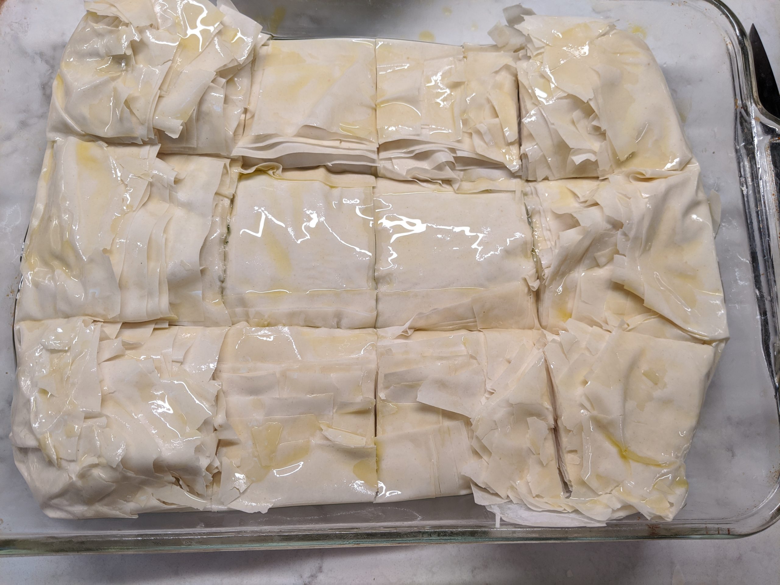 - Spread the filling over the phyllo dough evenly. Place two more sheets of phyllo on top, and brush with olive oil.