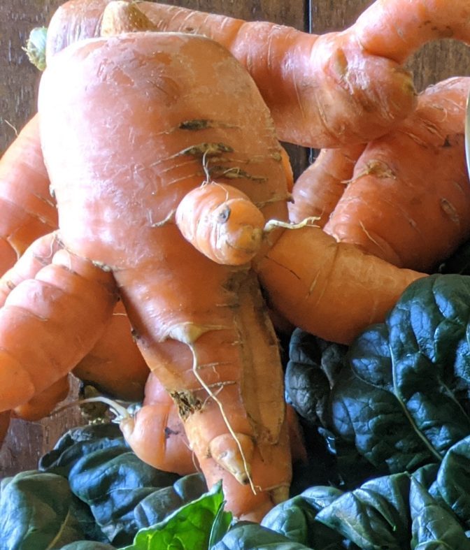 - Sign-up for a Community Supported Agriculture (CSA) farm share. This means a local farm will provide you with a box of produce picked fresh every week. They use what they have, ugly or not. I’ve received some really funny looking food over the years (see pics below). Honestly, those are the ones the kids want to eat! Check out my article How to Choose a CSA to find out more information about this option.